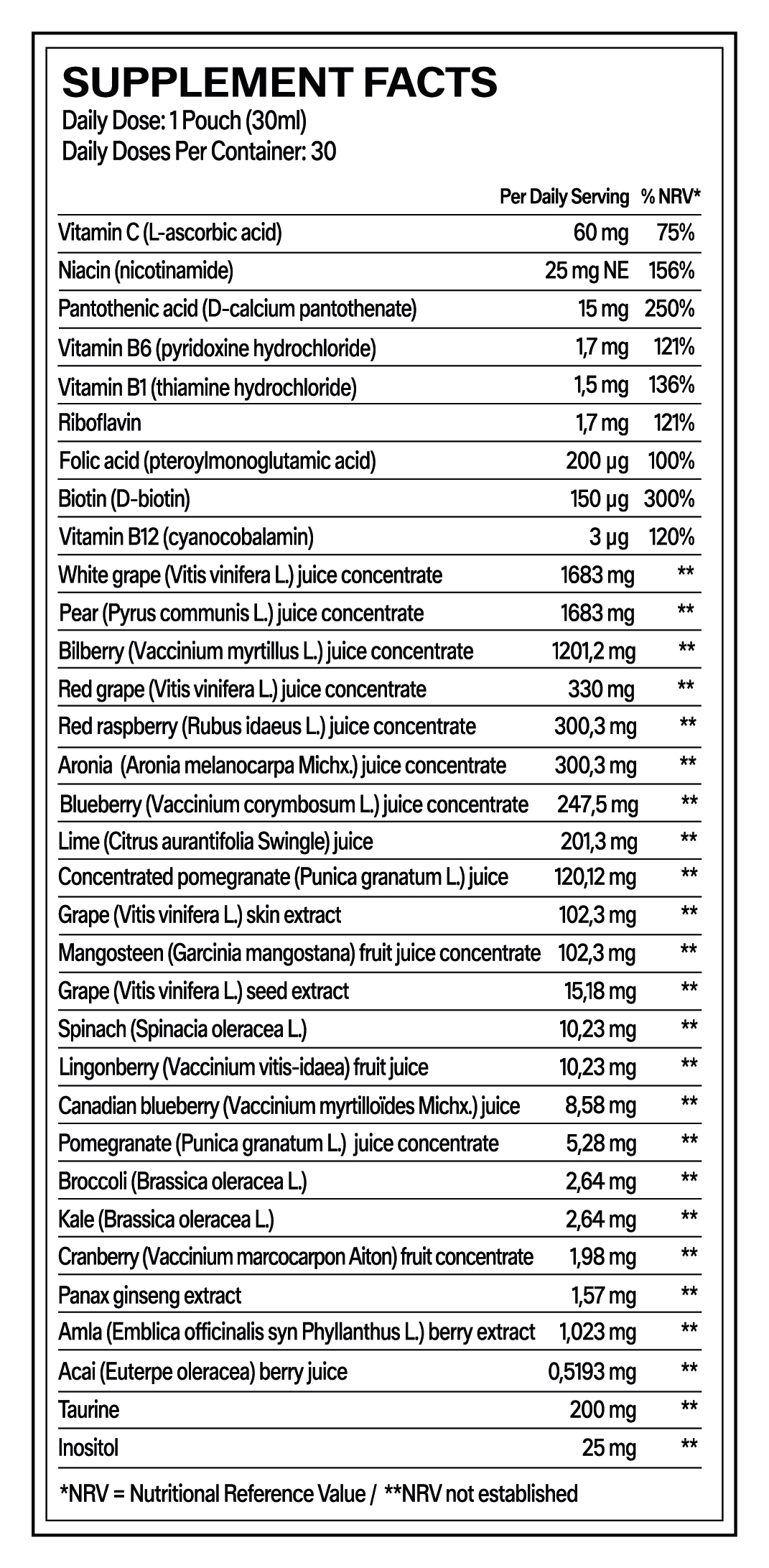Ingredients: Water, fructose corn syrup, white grape (Vitis vinifera L.) juice concentrate, pear (Pyrus communis L.) juice concentrate, bilberry (Vaccinium myrtillus L.) juice concentrate, red grape (Vitis vinifera L.) juice concentrate, red raspberry (Rubus idaeus L.) juice concentrate, aronia (Aronia melanocarpa Michx.) juice concentrate, taurine, blueberry (High Bush) (Vaccinium corymbosum L.) juice concentrate, lime (Citrus aurantifolia Swingle) juice, colouring food (black carrot concentrate), thickener: dextrin, corn starch, acidity regulatory: malic acid, flavour, acidity regulatory: citric acid, concentrated pomegranate (Punica granatum L.) juice, grape (Vitis vinifera L.) skin extract, mangosteen (Garcinia mangostana) fruit juice concentrate, vitamin C (L-ascorbic acid), thickener: xanthan gum, thickener: dextrin, niacin (nicotinamide), inositol, pantothenic acid (D-pantothenate, calcium), anti-caking agent: tricalcium phosphate, grape (Vitis vinifera L.) seed extract, sweetener: steviol glycoside from Stevia, spinach (Spinacia oleracea L.), lingonberry (Vaccinium vitis-idaea) fruit juice, Canadian blueberry (Vaccinium myrtilloids Michx.) juice, pomegranate (Punica granatum L.) juice concentrate, broccoli (Brassica oleracea L.), kale (Brassica oleracea L.), vitamin B6 (pyridoxine hydrochloride), vitamin B1 (thiamine hydrochloride), riboflavin, cranberry (Vaccinium macrocarpon Aiton) fruit concentrate, panax ginseng extract, thickener: gum acacia, amla (Emblica officinalis syn Phyllanthus L.) berry extract, acai (Euterpe oleracea) berry juice, anti-caking agent: dicalcium phosphate, folic acid (pteroylmonoglutamic acid), biotin (D-biotin), vitamin B12 (cyanocobalamin).