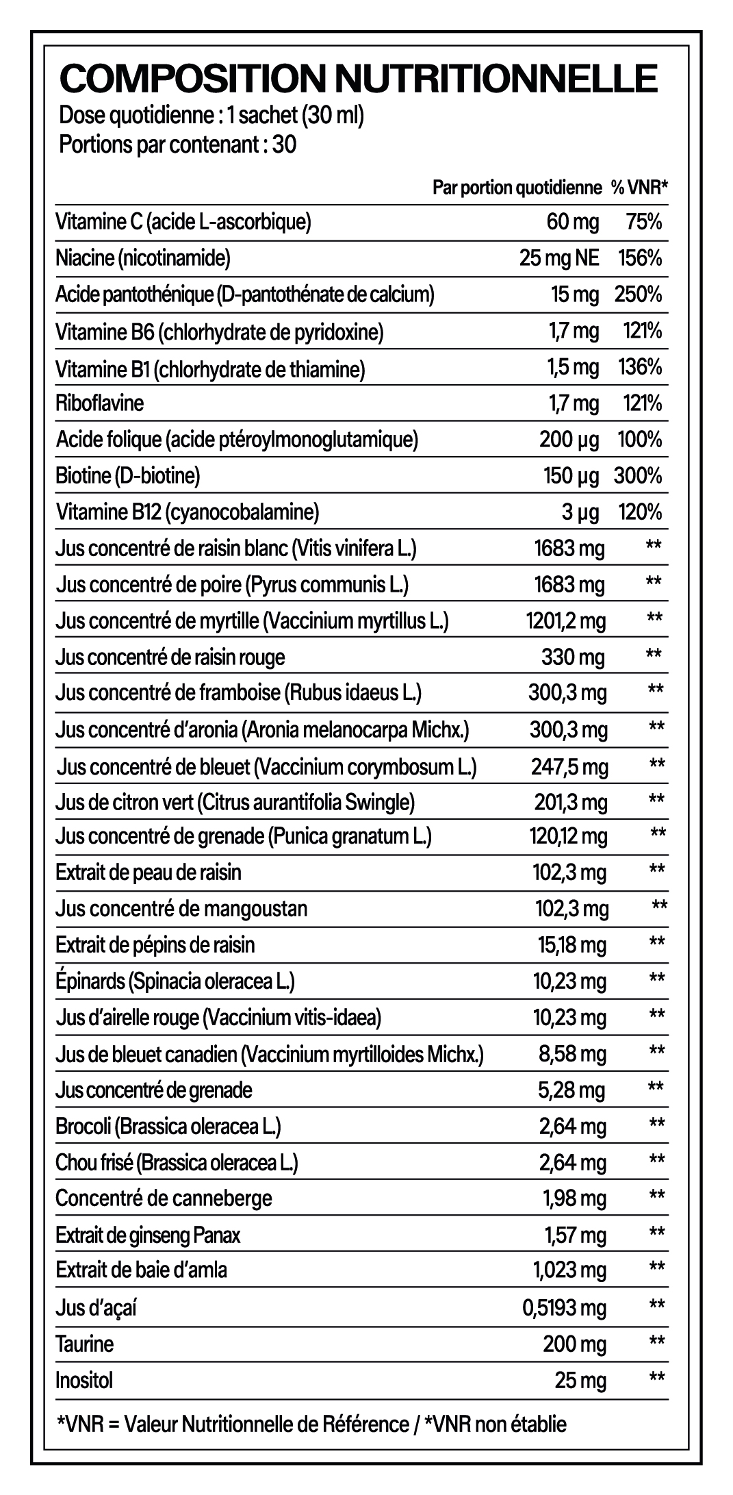 Ingredients : Eau, sirop de fructose de maïs, concentré de jus de raisin blanc (Vitis vinifera L.), concentré de jus de poire (Pyrus communis L.), concentré de jus de myrtille (Vaccinium myrtillus L.), concentré de jus de raisin rouge (Vitis vinifera L.), concentré de jus de framboise rouge (Rubus idaeus L.), concentré de jus d’aronia (Aronia melanocarpa Michx.), taurine, concentré de jus de myrtille (High Bush) (Vaccinium corymbosum L.), jus de citron vert (Citrus aurantifolia Swingle), colorant alimentaire (concentré de carotte noire), épaississant : dextrine, amidon de maïs, régulateur d’acidité : acide malique, arôme, régulateur d’acidité : acide citrique, jus concentré de grenade (Punica granatum L.), extrait de peau de raisin (Vitis vinifera L.), concentré de jus de mangoustan (Garcinia mangostana), vitamine C (L-ascorbique), épaississant : gomme xanthane, épaississant : dextrine, niacine (nicotinamide), inositol, acide pantothénique (D-panthothénate de calcium), antiagglomérant : phosphate tricalcique, extrait de pépins de raisin (Vitis vinifera L.), édulcorant : glycosides de stéviol issus de Stevia, épinard (Spinacia oleracea L.), jus de fruit d’airelle rouge (Vaccinium vitis-idaea), jus de myrtille canadienne (Vaccinium myrtilloides Michx.), concentré de jus de grenade (Punica granatum L.), brocoli (Brassica oleracea L.), chou kale (Brassica oleracea L.), vitamine B6 (chlorhydrate de pyridoxine), vitamine B1 (chlorhydrate de thiamine), riboflavine, concentré de fruit de canneberge (Vaccinium macrocarpon Aiton), extrait de ginseng Panax, épaississant : gomme arabique, extrait de baie d’amla (Emblica officinalis syn Phyllanthus L.), jus de baie d’açaï (Euterpe oleracea), antiagglomérant : phosphate dicalcique, acide folique (acide ptéroylmonoglutamique), biotine (D-biotine), vitamine B12 (cyanocobalamine).